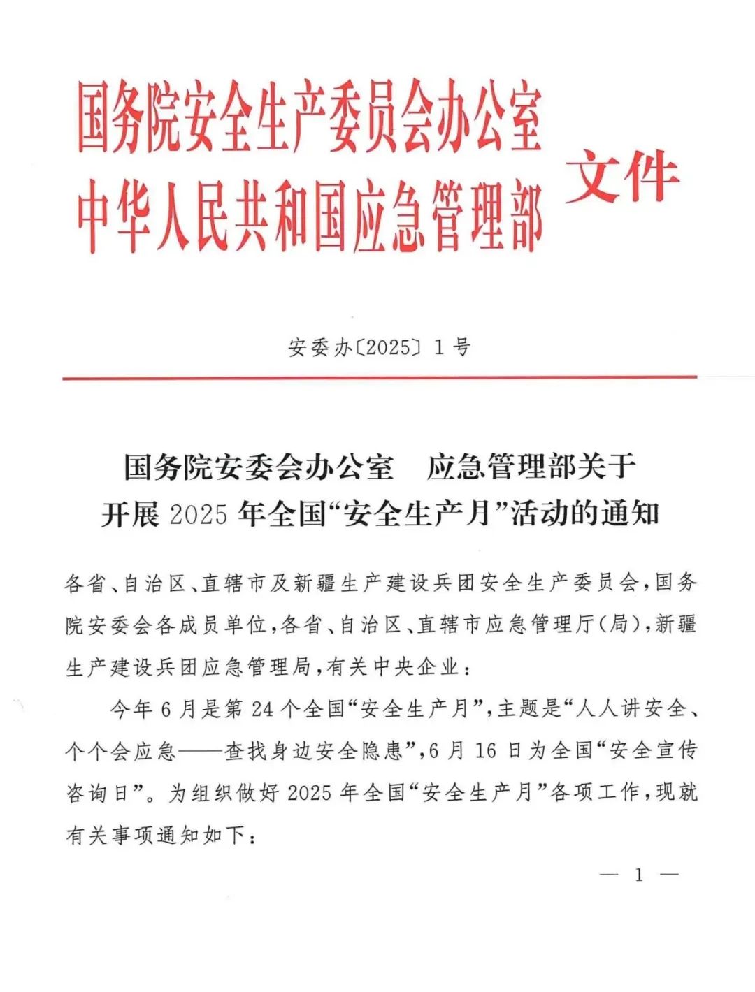 国务院安委会办公室 应急管理部关于开展2025年全国“安全生产月”活动的通知